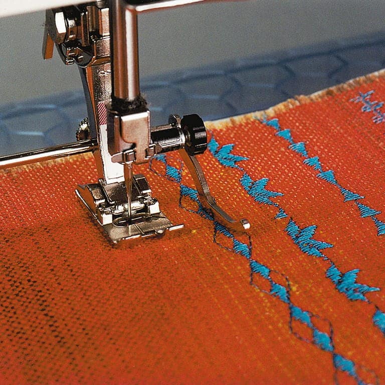 It can be attached quite easily by sliding its rod through the appropriate holes in the presser foot, then tightening the screw. This tool is available in two versions, attached to the right or left of the needle, respectively.