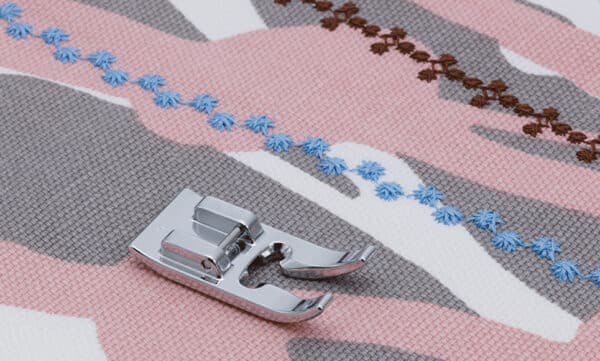 This foot allows you to sew a beautiful, decorative touch resembling handsewn ‘knotted’ candlewicking stitch.