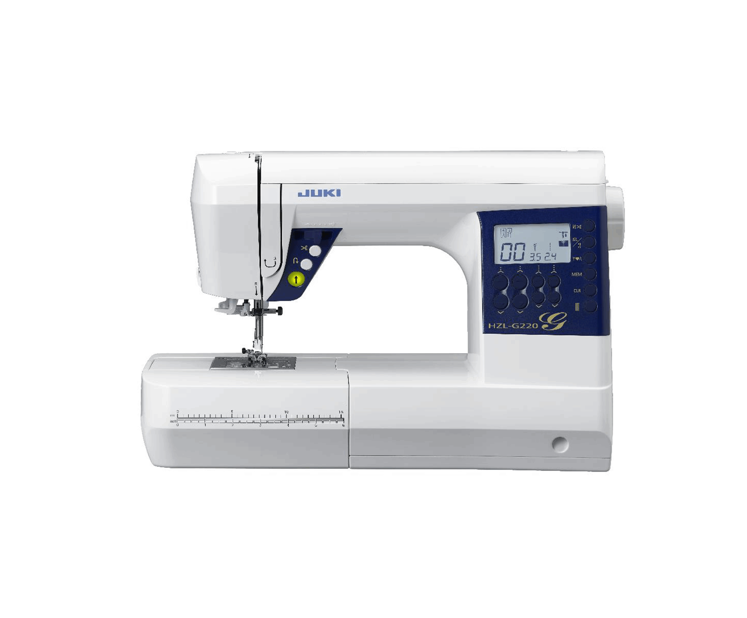 The JUKI HZL-G220 is a full-sized computerised sewing machine with a bright LCD screen, auto thread trimming function, wide underarm space and create beautiful seams with the box feeding system it comes equipped with 180 stitch patterns that include 1 font letter, 7 buttonhole patterns, and a wide variety of accessories.