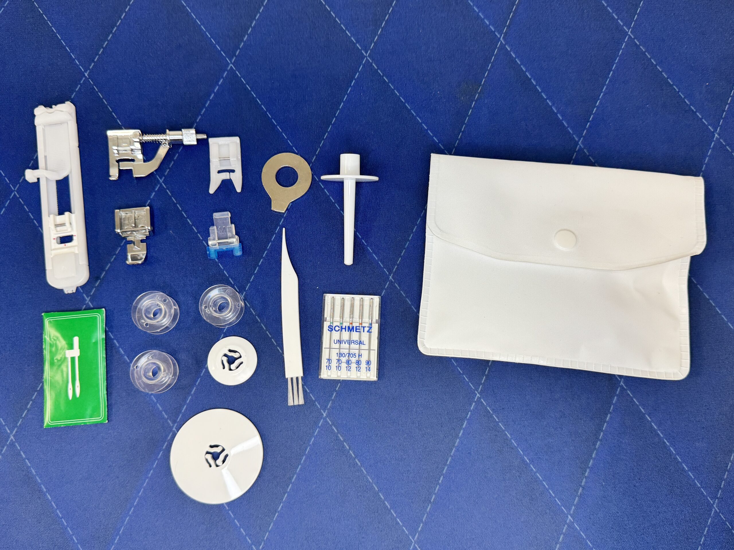 The included non-stick presser foot glides over vinyls and leathers. The J foot with levelling button makes sewing with thicker fabrics a piece of cake.